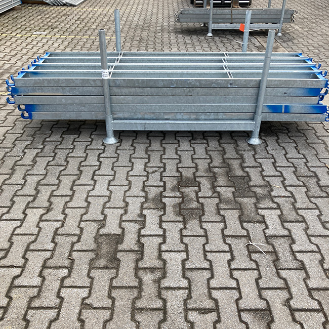 Stahlbohlen sind die haltbarste und robusteste Form des Gerüstbelags. Durch die versetzten Endklauen lassen sich die Bohlen „lückenlos“ auf den gleichen Riegel legen. Eine Aushebesicherung ist direkt mit eingebaut. Der Ausgleichsbelag kommt dann zum Einsatz, wenn die Feldtiefe keine ausschließliche Belegung mit 0,32 m Belägen zulässt.