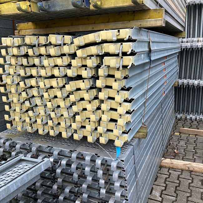 Stahlbohlen sind die haltbarste und robusteste Form des Gerüstbelags. Durch die versetzten Endklauen lassen sich die Bohlen „lückenlos“ auf den gleichen Riegel legen. Eine Aushebesicherung ist direkt mit eingebaut. Der Ausgleichsbelag kommt dann zum Einsatz, wenn die Feldtiefe keine ausschließliche Belegung mit 0,32 m Belägen zulässt.